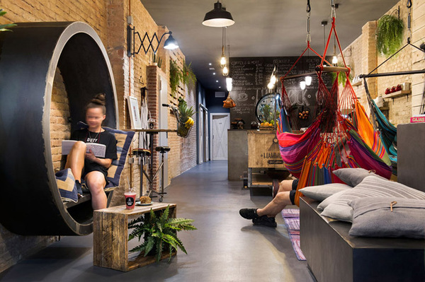 多彩的吊床由植物染色纖維制成、如皇冠一般組合懸掛的綠植;未經(jīng)修飾的粗糙磚墻與光滑的防銹鐵件形成材質(zhì)上的對(duì)比;拋光混凝土地面映襯著鮮綠與溫暖的質(zhì)感。