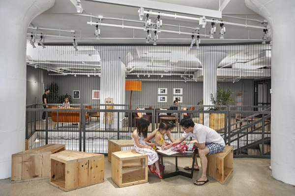注重復(fù)古和手工藝品的Etsy總部,自然要體現(xiàn)這一獨(dú)特元素的設(shè)計(jì)和運(yùn)用,室內(nèi)大量的藝術(shù)品、裝飾品和家具都來自當(dāng)?shù)氐乃囆g(shù)家以及Etsy的網(wǎng)店賣家。入口處手工制作的大型吊燈更是令時(shí)尚辦公網(wǎng)的小伙伴們驚艷。在Etsy總部沒有華麗的材料堆砌,只有隨處可見的藝術(shù)品、墻面壁畫、充滿創(chuàng)意的手工藝品、有趣的裝飾品,還有生機(jī)勃勃的綠色植物。